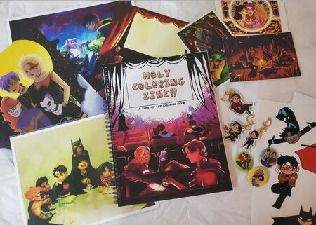 This batfamily coloring book zine sold 170+ copies in preorders and made $2000 to donate to NAACP LDF and Bright Prospect. I worked as head mod, in charge of organization, finance, layout, and shipping, as well as contributing art and merch.